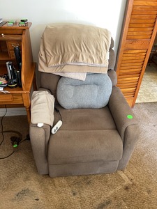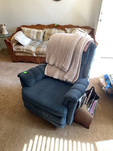 Recliner with blankets and magazine basket |